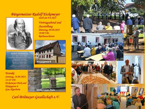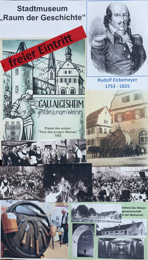 Am Sonntag des Gau-Algesheimer „Fest des jungen Weines“ (12.10.2025) öffnete die Carl-Brilmayer-Gesellschaft nachmittags das Stadtmuseum „Raum der Geschichte" mit der Präsentation althergebrachter Arbeitsgeräte der Gau-Algesheimer Winzer und Küfer sowie einer Darstellung der Bearbeitung und Vermarktung des Weines in der ehemaligen Winzergenossenschaft. Darüber hinaus wurde als ganz besonderer Glanzpunkt die Sonderausstellung über den General Rudolf Eickemeyer geboten, der von 1811 bis 1822 Bürgermeister in Gau-Algesheim war und sich zu seinen Zeiten für den Weinbau sehr engagierte.