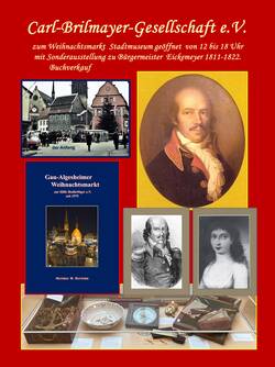Der „etwas andere“ Gau-Algesheimer Weihnachtsmarkt findet am ersten Adventswochenende vom 29. bis 30. November statt (mehr dazu hier). Die Carl-Brilmayer-Gesellschaft beteiligt sich an diesen beiden Tagen mit einer Öffnung ihres Archivs und des Stadtmuseums „Raum der Geschichte“ im 2. OG der Rathausscheune, Eingang Kreuzhof 2, von 12 bis 18 Uhr. Damit bieten wir auch die letzte Gelegenheit zum Besuch der Sonderausstellung über den General Rudolf Eickemeyer, der von 1811 bis 1822 Bürgermeister in Gau-Algesheim war, denn danach wird diese Sonderausstellung abgebaut. Außerdem können Exponate aus unseren umfangreichen Sammlungen erworben werden, die wir gegen einen Weihnachtsmarkt-Obolus anbieten. Der Erlös aus dem Verkauf der verschiedenen Exponate wird vollumfänglich dem Weihnachtsmarkt e.V. zur Verfügung gestellt.