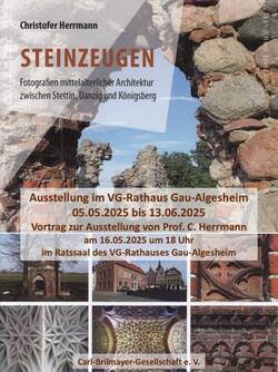 Die Carl-Brilmayer-Gesellschaft zeigte von Montag, dem 05. 05. 2025 bis zum Freitag, dem 13. 06. 2025 im Rathaus der Verbandsgemeinde Gau-Algesheim eine Ausstellung von Architekturfotografien mittelalterlicher Gebäude aus Ost- und Westpreußen. Der Urheber dieser Ausstellung ist der aus Gau-Algesheim stammende Kunsthistoriker Prof. Dr. Christofer Herrmann, der sich u. a. auf mittelalterliche Architektur in Deutschland, Polen und dem Baltikum spezialisiert hat. Aus seinem umfangreichen Fotoarchiv eigener Aufnahmen stammen die großformatigen Fotos dieser Ausstellung. Auch konnte Professor Herrmann für einen Vortrag über die historische und baugeschichtliche Seite der Ausstellung gewonnen werden. Der Vortrag fand am Freitag, dem 16. Mai 2025, 18:00 Uhr im Ratssaal der Verbandsgemeinde Gau-Algesheim statt.