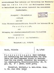 - Abschluss des Studiums der Staatswissenschaften in Frankfurt mit der Dissertation „Untersuchungen über Aufnahme und Verbreitung der Freiheitsideen von Adam Smith und Stellungnahme hierzu in Deutschland bis zum ersten Jahrzehnt des 19. Jahrhunderts.“ in der Reihe: Dissertationen der Wirtschafts- und Sozialwissenschaft-lichen Fakultät der Universität Frankfurt am Main, Frankfurt am Main, 1924.